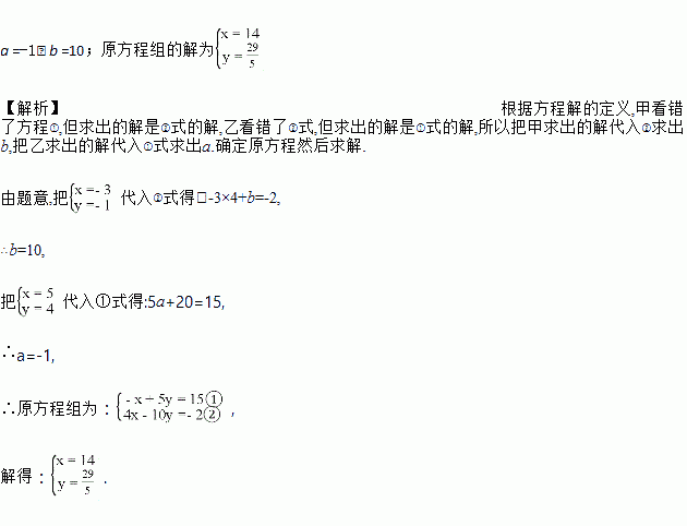 已知方程组 由于甲看错了方程①中的得到方程组的解为;乙看错了方程②中的得到方程组的解为,若按正确的a,b计算,请你求原方程组的解.