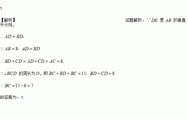 如图,△ABC中,AB=AC,AB的垂直平分线DE分别交AC、AB于点D、E.AB=8,△CBD周长为15,则BC=_________________.