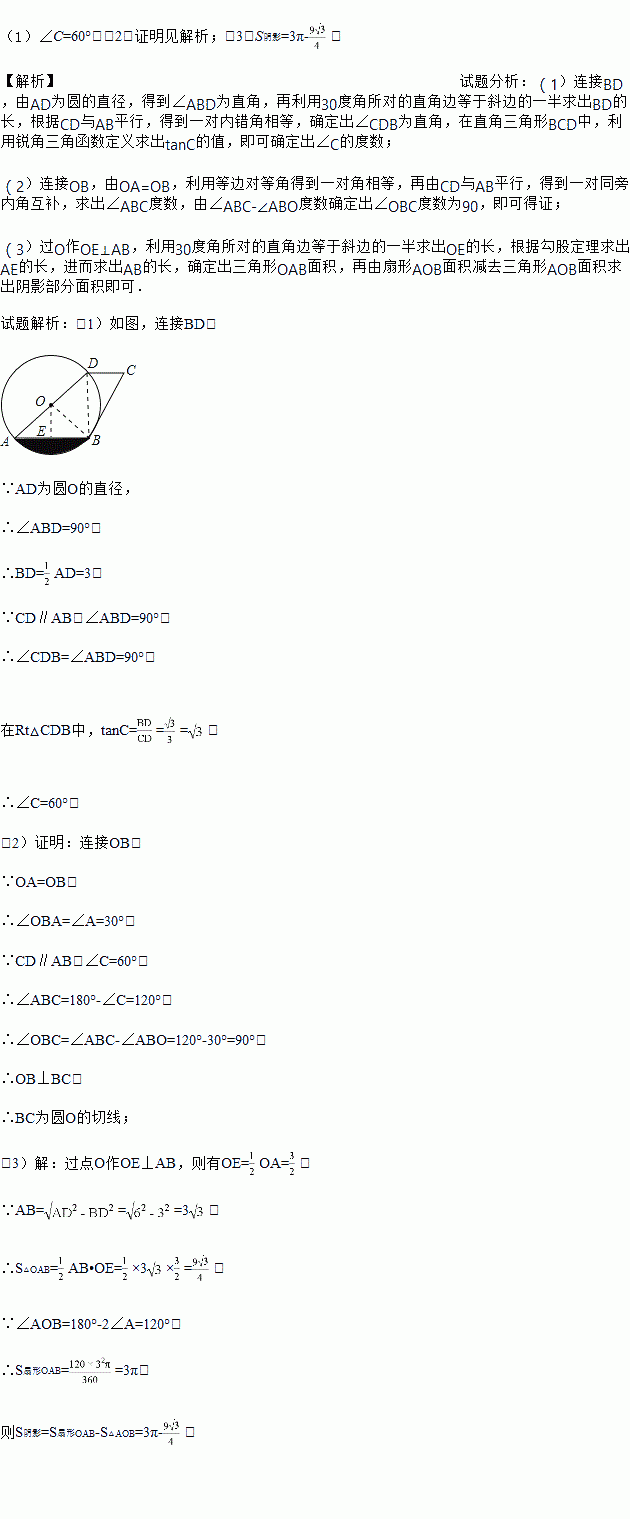 如图,⊙O的直径AD长为6,AB是弦,∠A=30°,CD∥AB,且CD=.