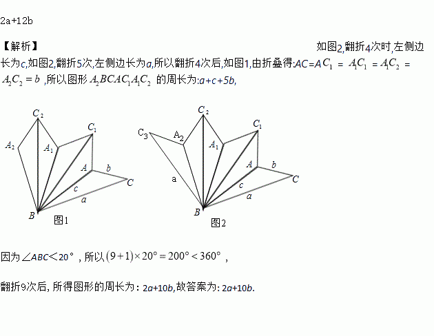 在△ABC中,∠ABC<20°,三边长分别为a,b,c,将△ABC沿直线BA翻折,得到△ABC1;然后将△ABC1沿直线BC1翻折,得到△A1BC1;再将△A1BC1沿直线A1B翻折,得到△A1BC2;…,若翻折4次后,得到图形A2BCAC1A1C2的周长为a+c+5b,则翻折11次后,所得图形的周长为_____________.(结果用含有a,b,c的式子表示)