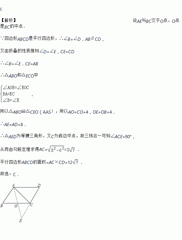 在平行四边形ABCD中,AB=6,AD=8,∠B是锐角,将△ACD沿对角线AC折叠,点D落在△ABC所在平面内的点E处.如果AE过BC的中点,则平行四边形ABCD的面积等于( )