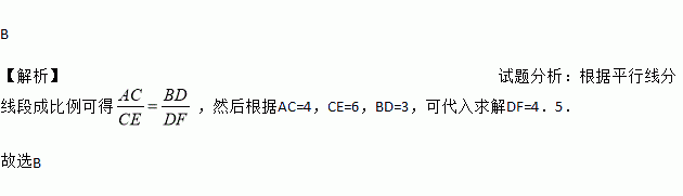 B 【解析】试题分析:根据平行线分线段成比例可得,然后根据AC=4,CE=6,BD=3,可代入求解DF=4.5. 故选B