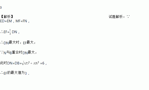 (题文)如图,四边形ABCD中,∠A=90°,AB=3,AD=3,点M,N分别为线段BC,AB上的动点(含端点,但点M不与点B重合),点E,F分别为DM,MN的中点,则EF长度的最大值为 .
