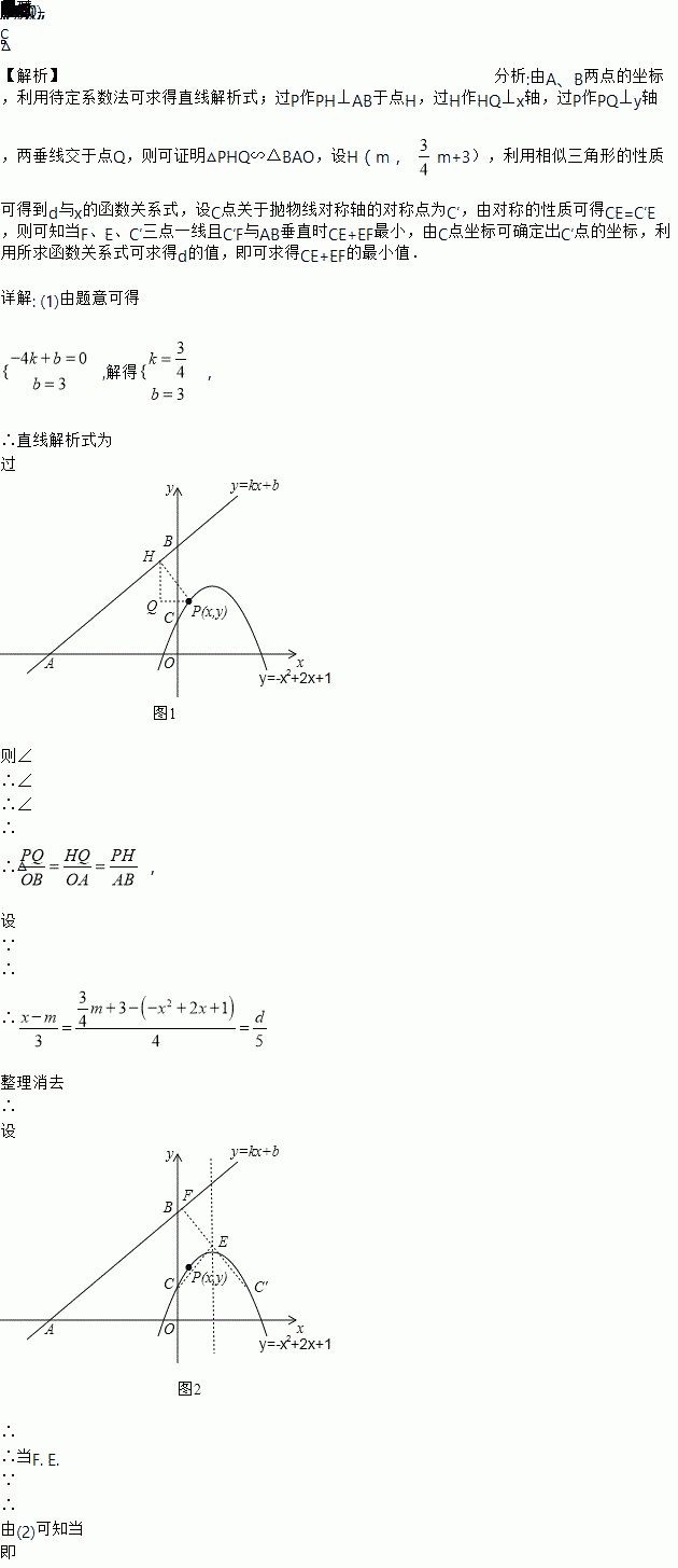 如图,直线y=kx+b(k、b为常数)分别与x轴、y轴交于点A(﹣4,0)、B(0,3),抛物线y=﹣x2+2x+1与y轴交于点C,点E在抛物线y=﹣x2+2x+1的对称轴上移动,点F在直线AB上移动,CE+EF的最小值是( )