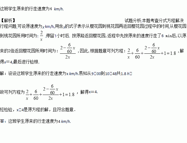 某校组织学生到生态园春游,某班学生9:00从樱花园出发,匀速前往距樱花园2 km的桃花园.在桃花园停留1 h后,按原路返回樱花园,返程中先按原来的速度行走了6 min,随后接到通知,要尽快回到樱花园,故速度提高到原来的2倍,于10:48回到了樱花园,求这班学生原来的行走速度.