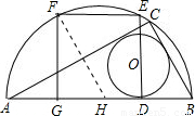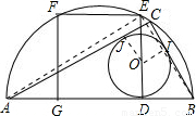 如图,AB为半圆的直径,C是半圆弧上一点,正方形DEFG的一边DG在直径AB上,另一边DE过△ABC的内切圆圆心O,且点E在半圆弧上.①若正方形的顶点F也在半圆弧上,则半圆的半径与正方形边长的比是 ;