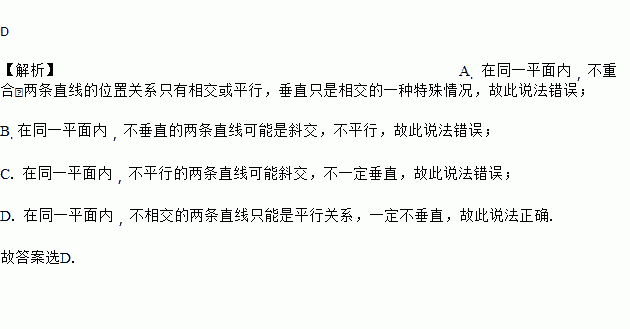 D 【解析】A. 在同一平面内,不重合的两条直线的位置关系只有相交或平行,垂直只是相交的一种特殊情况,故此说法错误; B. 在同一平面内,不垂直的两条直线可能是斜交,不平行,故此说法错误; C. 在同一平面内,不平行的两条直线可能斜交,不一定垂直,故此说法错误; D. 在同一平面内,不相交的两条直线只能是平行关系,一定不垂直,故此说法正确. 故答案选D.