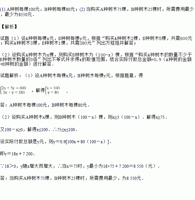 »ÆÊ¯ÊÐÔÚ´´½¨¹ú¼Ò¼¶ÎÄÃ÷ÎÀÉú³ÇÊÐÖУ¬ÂÌ»¯µµ´Î²»¶ÏÌáÉý£®Ä³Ð£¼Æ»®¹º½øA£¬BÁ½ÖÖÊ÷ľ¹²100¿Ã½øÐÐУ԰ÂÌ»¯Éý¼¶£¬¾Êг¡µ÷²é£º¹ºÂòAÖÖÊ÷ľ2¿Ã£¬BÖÖÊ÷ľ5¿Ã£¬¹²Ðè600Ôª£»¹ºÂòAÖÖÊ÷ľ3¿Ã£¬BÖÖÊ÷ľ1¿Ã£¬¹²Ðè380Ôª£®