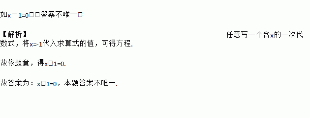 如x-1=0,(答案不唯一) 【解析】任意写一个含x的一次代数式,将x=-1代入求算式的值,可得方程. 故依题意,得x-1=0. 故答案为:x-1=0,本题答案不唯一.