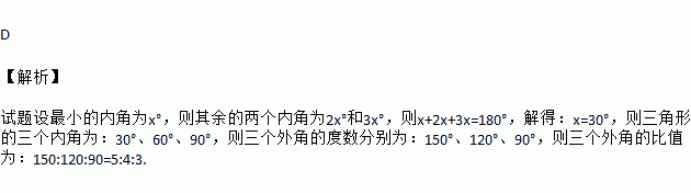 若一个三角形的三个内角的度数之比为1:2:3,那么相对应的三个外角的度数之比为( )