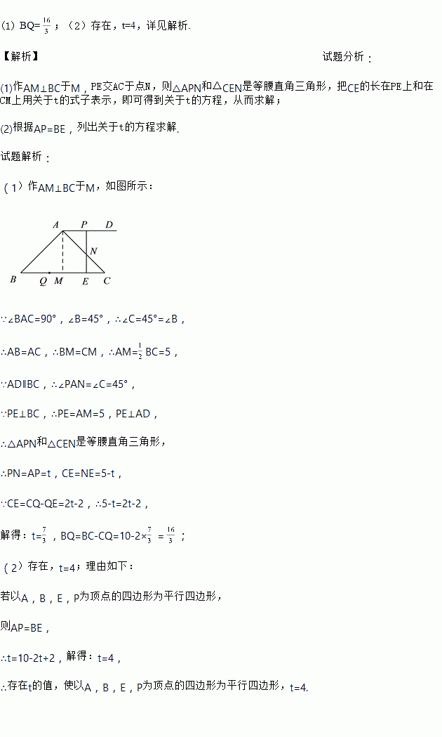 如图,在△ABC中,∠BAC=90°,∠B=45°,BC=10,过点A作AD∥BC,且点D在点A的右侧.点P从点A出发沿射线AD方向以每秒1个单位的速度运动,同时点Q从点C出发沿射线CB方向以每秒2个单位的速度运动,在线段QC上取点E,使得QE=2,连结PE,设点P的运动时间为t秒.