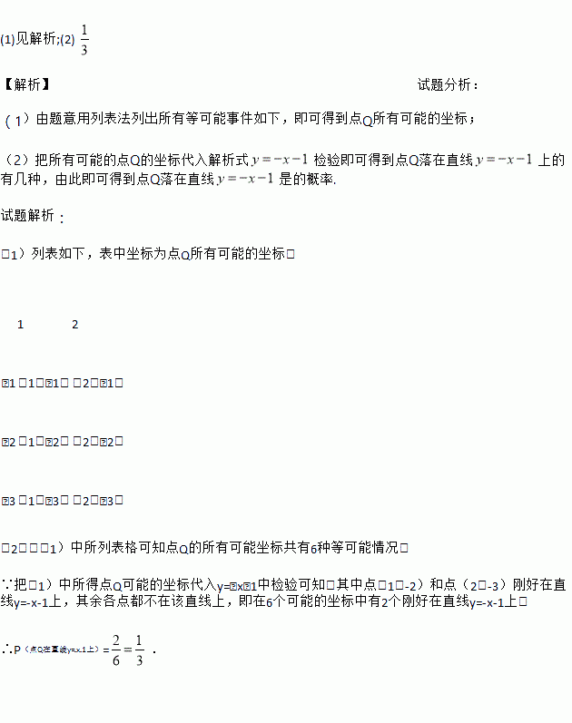 (1)见解析;(2) 【解析】试题分析: (1)由题意用列表法列出所有等可能事件如下,即可得到点Q所有可能的坐标; (2)把所有可能的点Q的坐标代入解析式检验即可得到点Q落在直线上的有几种,由此即可得到点Q落在直线是的概率. 试题解析: (1)列表如下,表中坐标为点Q所有可能的坐标: 1 2 ﹣1 (1,﹣1) (2,﹣1) ...