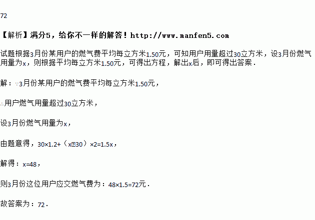 某市按以下规定收取每月的燃气费,用燃气如果不超过30立方米,按每立方米1.20元收费;如果超过30立方米,超过部分按每立方米2元收费.已知3月份某用户的燃气费平均每立方米1.50元,那么3月份这位用户应交燃气费 元.