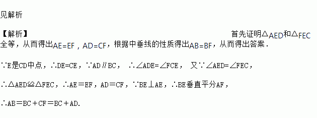如图,在四边形ABCD中,AD∥BC,E为CD的中点,连接AE、BE,BE⊥AE,延长AE交BC的延长线于点F.试说明:AB=BC+AD.