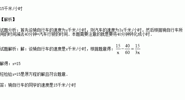 列方程解应用题:八年级学生到距离学校15千米的农科所参观,一部分学生骑自行车先走,走了40分钟后,其余同学乘汽车出发,结果两者同时到达.若汽车的速度是骑自行车同学速度的3倍,求骑自行车同学的速度.