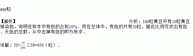 某人把50粒黄豆染色后与一袋黄豆充分混匀,接着抓出100粒黄豆,数出其中有10粒黄豆被染色,则这袋黄豆原来约有_____粒.