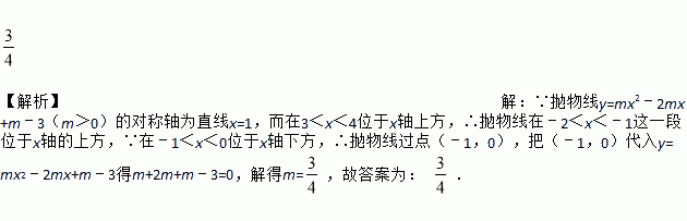 【解析】【解析】 ∵抛物线y=mx2﹣2mx+m﹣3(m>0)的对称轴为直线x=1,而在3<x<4位于x轴上方,∴抛物线在﹣2<x<﹣1这一段位于x轴的上方,∵在﹣1<x<0位于x轴下方,∴抛物线过点(﹣1,0),把(﹣1,0)代入y=mx2﹣2mx+m﹣3得m+2m+m﹣3=0,解得m=,故答案为: .