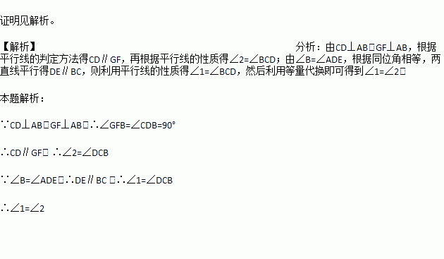 已知,如图,CD⊥AB,GF⊥AB于D、F.∠B=∠ADE,求证:∠1=∠2