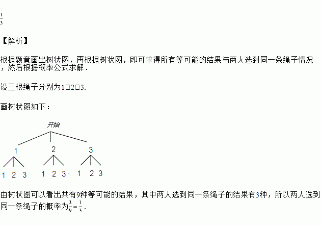 如图,有三条绳子穿过一片木板,姐妹俩分别站在木板的左、右两边,各选改编的一段绳子.若每边每段绳子被选中的机会相等,求两人选到同一条绳子的概率.