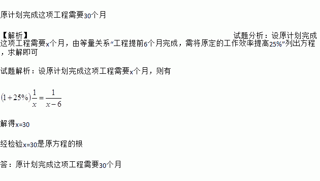 某市为了构建城市立体道路网络,决定修建一条轻轨铁路,为使工程提前半年完成,需要将工作效率提高25%,原计划完成这项工程需要多少个月?
