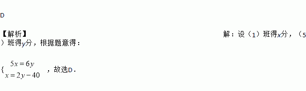 甲同学说:(1)班与(5)班得分比为6:5;乙同学说:(1)班得分比(5)班得分的2倍少40分.若设(1)班得x分,(5)班得y分,根据题意所列的方程组应为( )