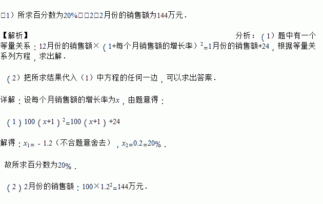 某超市去年12月份的销售额为100万元,今年2月份的销售额比今年1月份的销售额多24万元,若去年12月份到今年2月份每个月销售额增长的百分数相同.