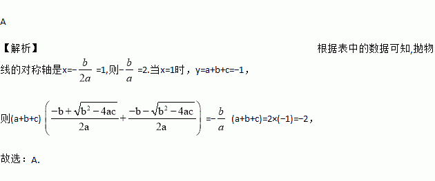 A 【解析】根据表中的数据可知,抛物线的对称轴是x=?=1,则?=2.当x=1时,y=a+b+c=?1, 则(a+b+c) =? (a+b+c)=2×(?1)=?2, 故选:A.