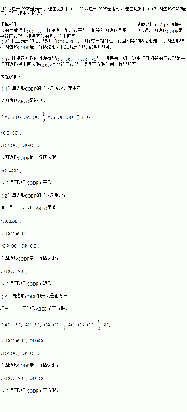 (3)如图③,如果题目中的矩形变为正方形,判断四边形CODP的形状并说明理由.