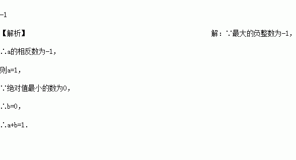 如果a的相反数是最大的负整数,b是绝对值最小的数,那么a+b=_______.