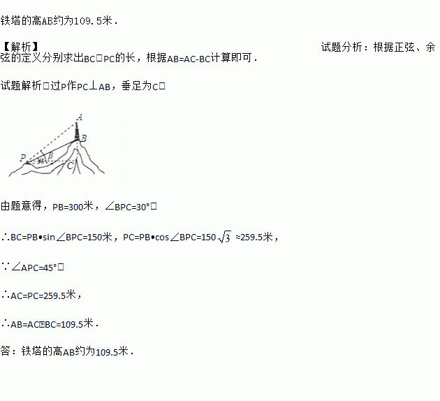 在一山顶有铁塔AB,从点P到铁塔底部B点有一条索道PB,索道长为300米,与水平线成角为α=30°,在P处测得A点的仰角为β=45°,试求铁塔的高AB.(精确到0.1米,其中
