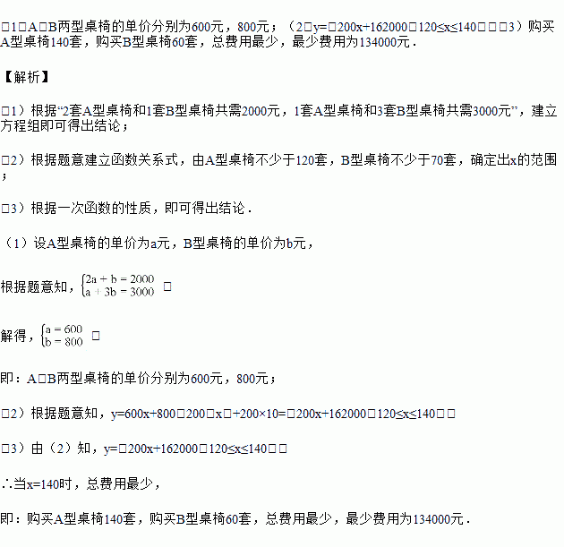 学校需要添置教师办公桌椅A、B两型共200套,已知2套A型桌椅和1套B型桌椅共需2000元,1套A型桌椅和3套B型桌椅共需3000元.