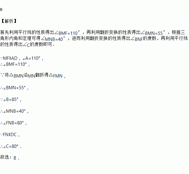 如图,在四边形ABCD中,∠A=110°,∠B=85°将△BMN沿着MN翻折,得到△FMN,若MF∥AD,FN∥DC,则∠C的度数为( )