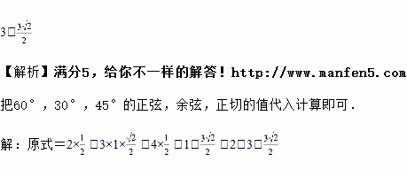 计算:2sin 30°-3tan 45°·sin 45°+4cos 60°.