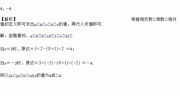 4,-4 【解析】根据相反数、倒数、绝对值的定义即可求出a、b、c、d、x的值,再代入求值即可. 【解析】 由题意知,a+b=0,cd=1,x=±2, 当x=2时,原式==4; 当x=-2时,原式==-4. 所以3x-(a+b+cd)x的值为4或-4.