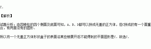 将一个无盖正方体形状盒子的表面沿某些棱剪开,展开后不能得到的平面图形是( )