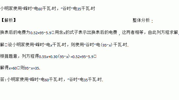 小明家对换表后最初使用的95千瓦·时电进行测算,发现比在换表前使用95千瓦·时电节约了5.9元,小明家使用“峰时”电和“谷时”电分别是多少千瓦·时?