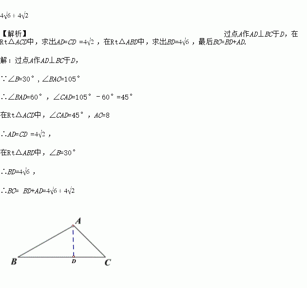 如图,在△ABC中,∠B=30°,∠BAC=105°, AC=8. 求BC的长.