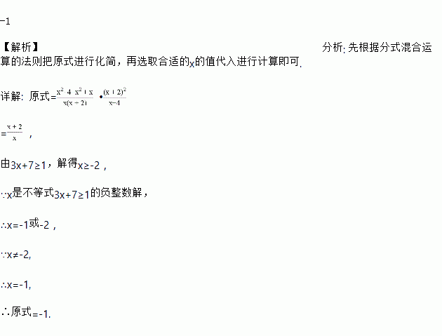 先化简:,再从不等式3x+7≥1的负整数解中,取适当的数求值.