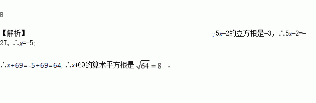 已知5x-2的立方根是-3,则x+69的算术平方根是___________;