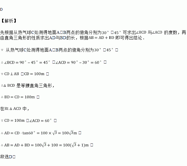 如图,从热气球C处测得地面A、B两点的俯角分别是30°、45°.如果此时热气球C处的高度CD为100米,点A、D、B在同一直线上,则AB两点的距离是( )