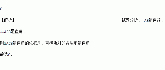 数学课上,老师让学生尺规作图画Rt△ABC,使其斜边AB=c,一条直角边BC=a,小明的作法如图所示,你认为这种作法中判断∠ACB是直角的依据是… ( )
