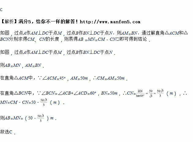 如图,为了测量河对岸l1上两棵古树A、B之间的距离,某数学兴趣小组在河这边沿着与AB平行的直线l2上取C、D两点,测得∠ACB=15°,∠ACD=45°,若l1、l2之间的距离为50m,则A、B之间的距离为( )