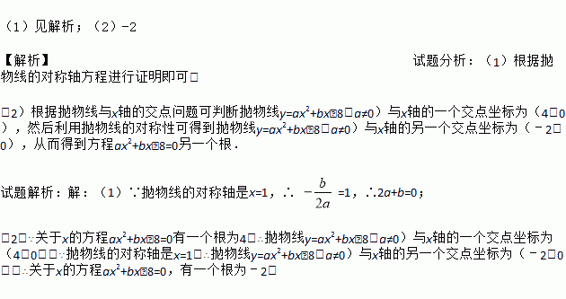 (1)见解析;(2)-2 【解析】试题分析:(1)根据抛物线的对称轴方程进行证明即可; (2)根据抛物线与x轴的交点问题可判断抛物线y=ax2+bx﹣8(a≠0)与x轴的一个交点坐标为(4,0),然后利用抛物线的对称性可得到抛物线y=ax2+bx﹣8(a≠0)与x轴的另一个交点坐标为(﹣2,0),从而得到方程ax2+bx﹣8=0另一个根. 试题解析:【解析】 (1)∵抛物线的对...