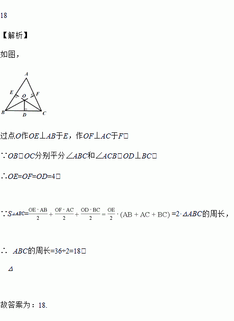 如图所示,已知△ABC的面积是36,OB、OC分别平分∠ABC和∠ACB,OD⊥BC于D,且OD=4,则△ABC的周长是_____.