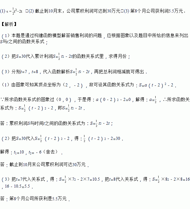 (1)由已知图象上的三点坐标,求累积利润s(万元)与时间t(月)之间的函数关系式;