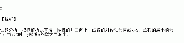 C 【解析】 试题分析:根据解析式可得:图像的开口向上;函数的对称轴为直线x=3;函数的最小值为1;当x<3时,y随着x的增大而减小.