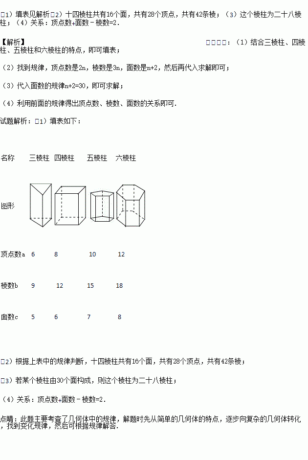 (2)根据上表中的规律判断,十四棱柱共有 个面,共有 个顶点,共有 条棱;