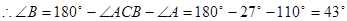 ,再根据三角形的外角的性质即可求得∠ACB的度数,最后根据三角形的内角和定理即可求得∠B的度数.