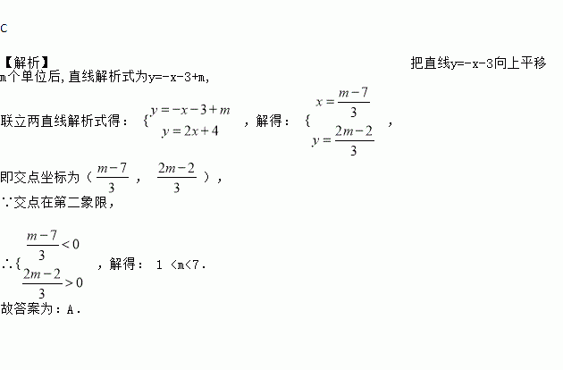 把直线y=﹣x+3向上平移m个单位后,与直线y=2x+4的交点在第一象限,则m的取值范围是( )