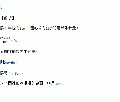用一张半径为9 cm、圆心角为120°的扇形纸片,做成一个圆锥形冰淇淋的侧面(不计接缝),那么这个圆锥形冰淇淋的底面半径是_________ cm.